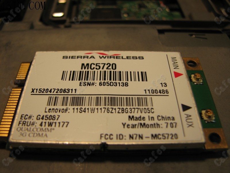 這塊就是我們的主角之一的MC5720 WWAN卡,基于CDMA制式,可以看到卡上直接寫上了ESN號,這是因為國外的CDMA都是是機卡一體化的,所以直接憑機身的ESN號加上營運商的IMSI就可以上網了,另外各位也可以近距離的看到“MAIN”和“AUX”兩個天線接口。這塊卡購自本壇的J26,成色也還不錯哦,在這里也要對J26提供的技術支持表示感謝咯。