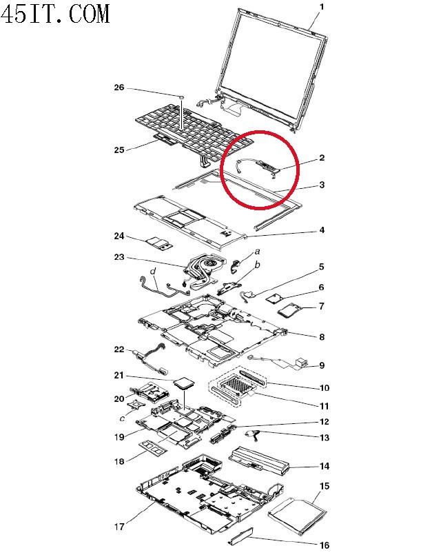 說到這里,我們先停一停,看看久違的T60P官方拆解圖,圖中用紅色圈圈圈起來的就是WWAN輔天線了,各位光看這個拆解圖,能不能想到這個輔助天線到底是裝在什么地方的呢?恕我愚笨,反正我當初是想了老久老久都沒想出來,還要到處求教,最后還是拆解的時候醒悟了,呵呵,各位看官想到沒有呢?