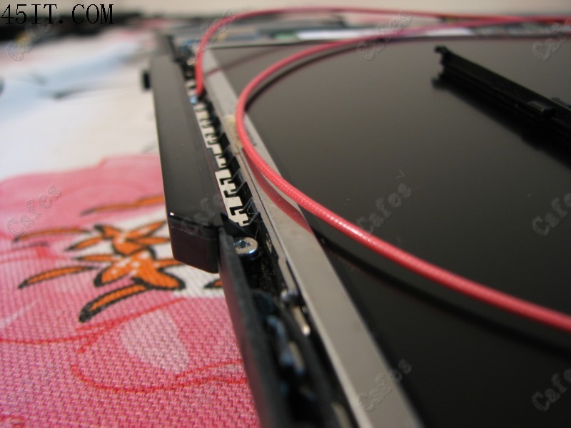 走線到了這里,就需要擰開下圖紅圈標注的螺絲,才能比較容易的把紅線穿過去了,有意思的是,剛好紅線這個位置特別做了補強,看來TP已經完全設計好走線的方式,我們只是“因其固然”而已了。