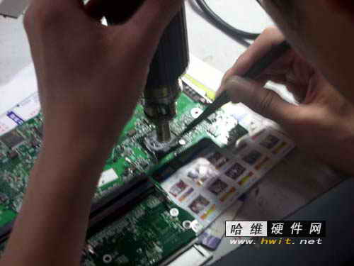 不一會兒,孫工就輕松的將主板拆解了出來,仔細的端詳了一下主板焊接顯卡的部分;指著這款顯卡告訴俺說,國產品牌很多機器都不同程度的出現如虛焊、用料不扎實等情況。而今天維修的這款主板看上去是LG給其代工的產品,雖不需要重新焊接,但是還是要用助焊劑重新吹一下(小編理解的意思應該是將原本虛焊的針腳用專用產品二次焊接一下),就可以使用了。