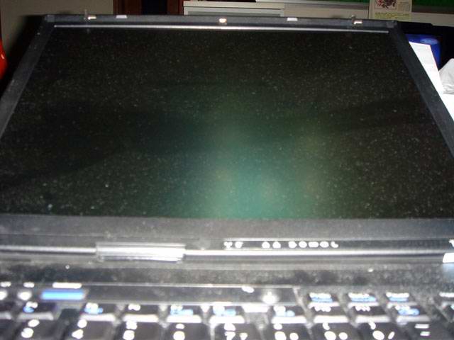屏幕上滿是灰塵(偶很愛護本本,所以只有灰塵沒有手印),還有點狀污跡若干(可能是剝桔子時濺上的)。