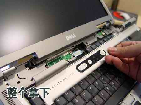 這種鍵盤的固定方式多見于DELL商務機型和日系的筆記本中,從機身后面看不見固定螺絲,拆解時要先把鍵盤上方的壓條拆除。
