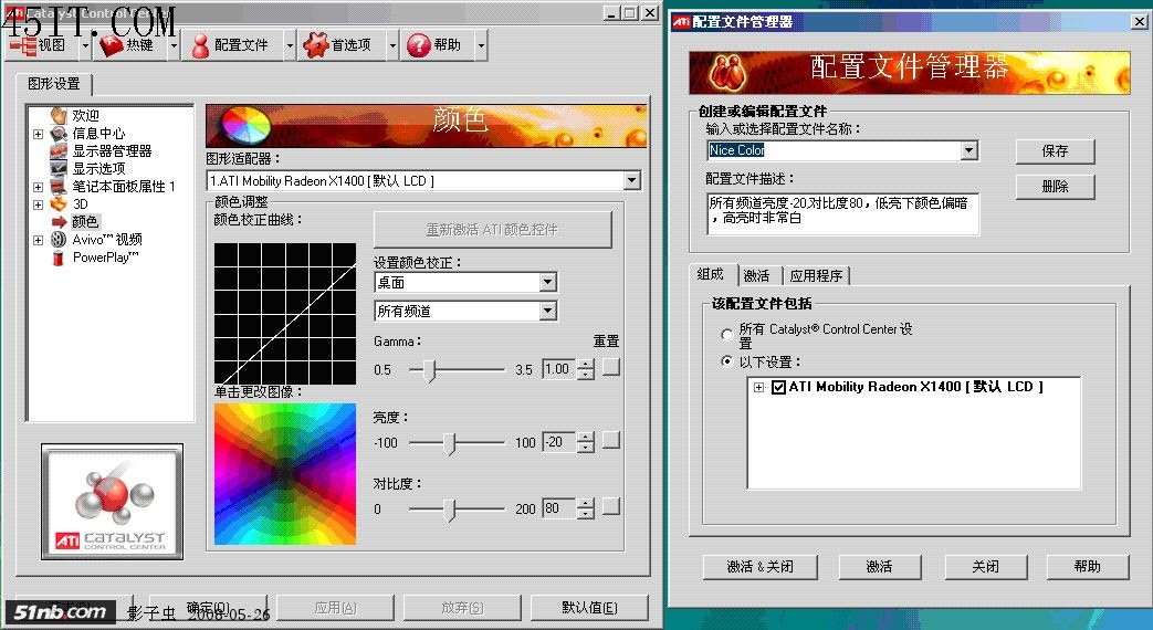 4、全部設置完以后,可以把這個以配置文件的形式保存下來,可以多設置幾組,在屏幕低亮的時候設一個調節值大的配置文件(因為低亮時屏幕看起來容易偏黃);屏幕亮度高的時候設一個調節值小的配置文件。設置好了某個設置文件以后,下次啟動也會自動應用這個設置文件的,不需要重新設置的!
