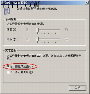 備注:通過上圖將播放中MIC靜音可以徹底解決嘯叫問題,但混音功能同時消失(如有)。如需此功能可調小播放中MIC音量,或取消麥克風錄音的MIC加強(部分機型在高級控制中帶有)以下為XP及vista截圖:XP圖示:(需要在高級控制中選擇) VISTA圖示: