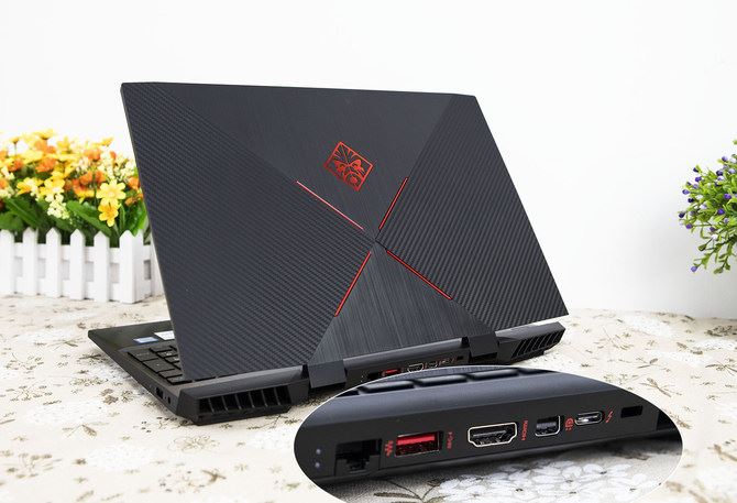 在機身接口方面,惠普暗影精靈4 Pro游戲本的主要接口區域被設計在頂部,與上代布局一模一樣。從左至右分別是RJ45網線接口、USB 3.1 Gen1接口、HDMI接口、miniDP接口、雷電3接口(兼容Type-C)以及安全鎖孔。