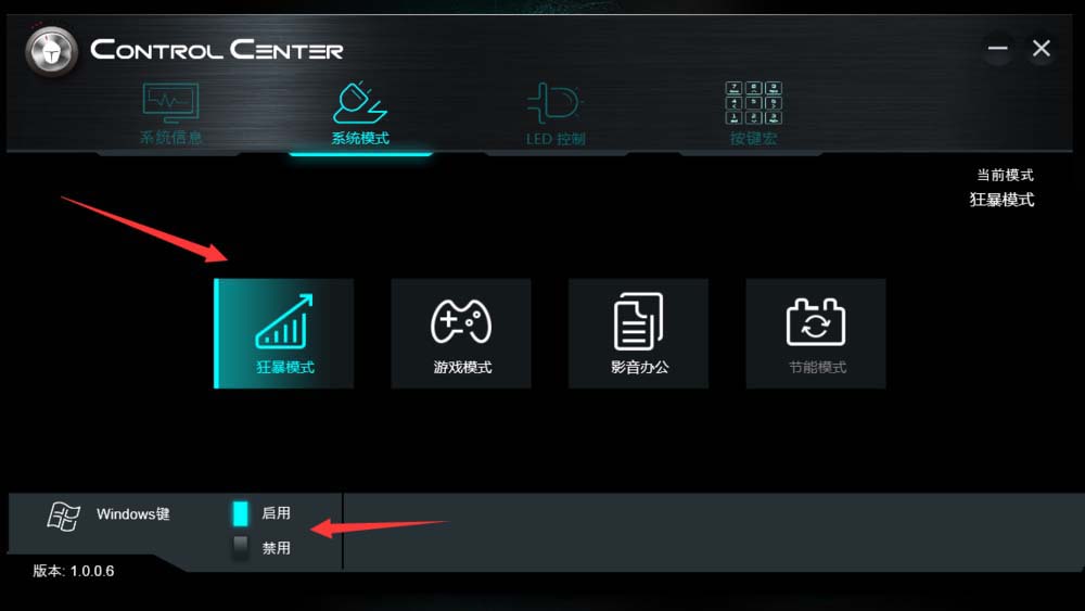 在第二板塊系統模式里,我們可以選擇對應的性能模式,系統預設了四種模式,分別是狂暴模式、游戲模式、影音辦公、節能模式。游戲本我們一般都會選擇狂暴模式(不同模式下風扇的轉速也不一樣)。同時還可以禁用Windows鍵,避免游戲過程中的誤觸情況。