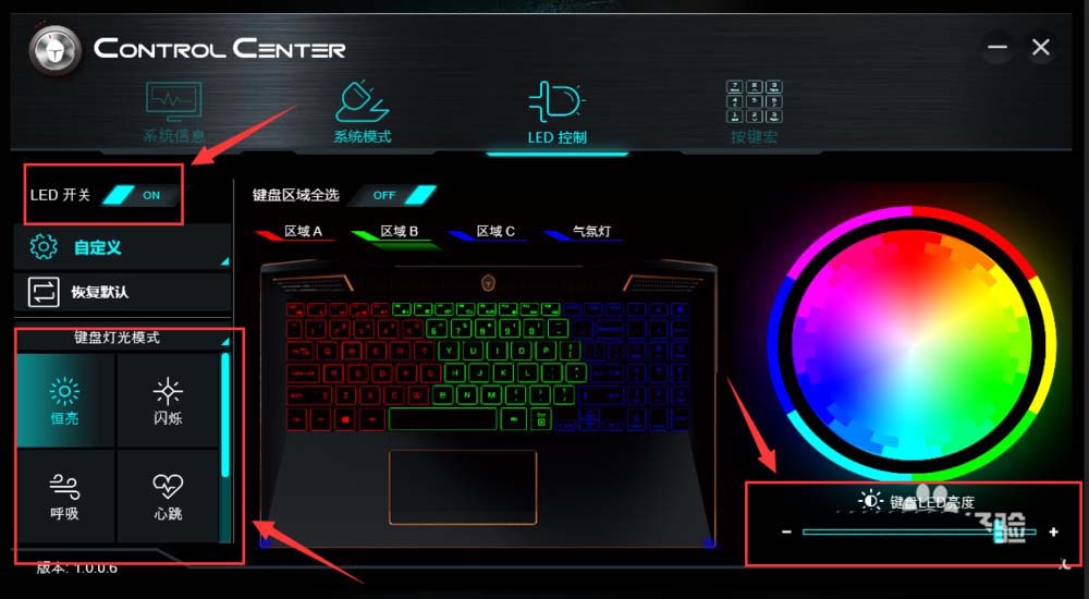 第三板塊LED控制是“控制中心”核心功能,主要負責設置鍵盤及氛圍燈的燈效及顏色。在鍵盤燈光模式中,系統預設6種模式可供選擇,右側還可調節鍵盤區域的燈光顏色及燈光亮度,支持約1680W種顏色。