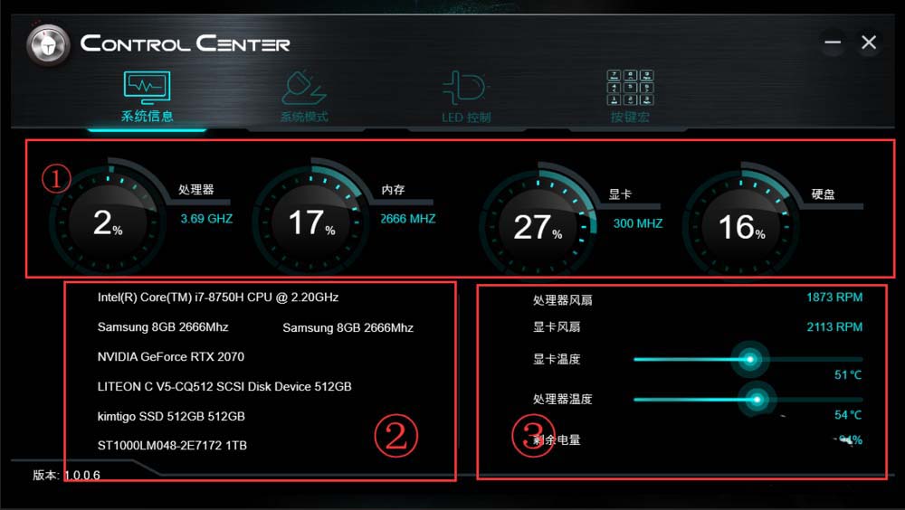 雷神911Pro的“控制中心”分為四個板塊:系統信息、系統模式、LED控制、按鍵宏。如圖所示,在系統信息板塊中,第①部分顯示的是硬件的一些頻率和占用,第②部分是電腦的基本配置型號,第③部分可以看到風扇的轉速,顯卡和處理器的溫度以及電池的剩余電量。信息顯示簡單明了。