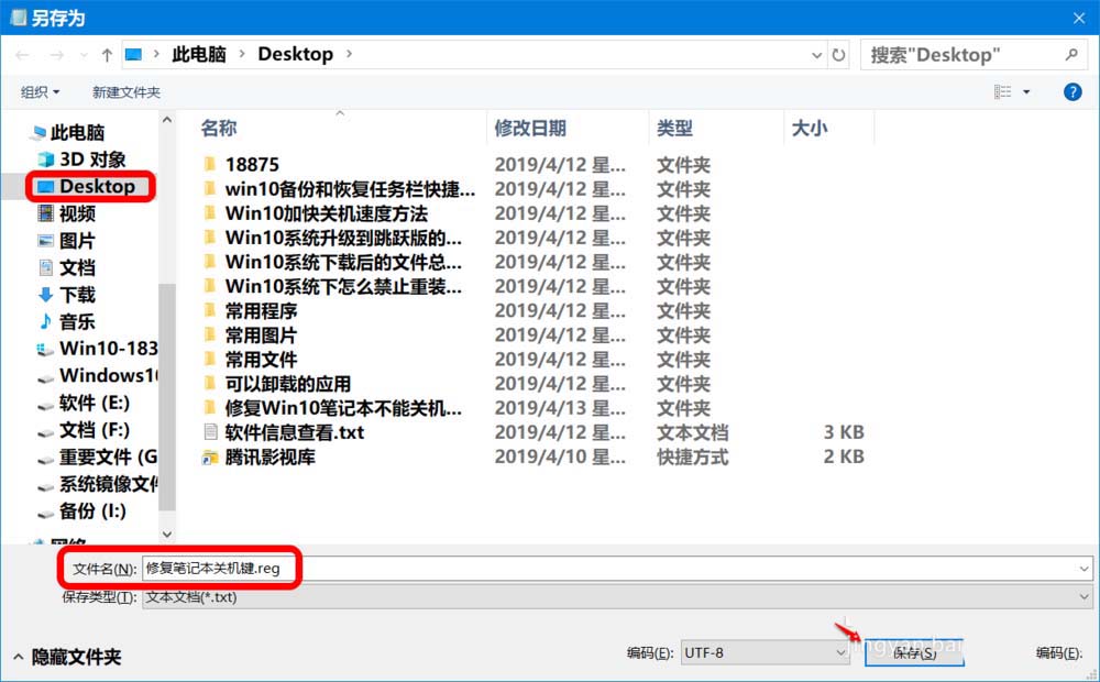 3、在另存為窗口中,我們先點擊窗口左側的【桌面】,在文件名(N)欄中輸入:修復筆記本關機鍵.reg,再點擊:保存;