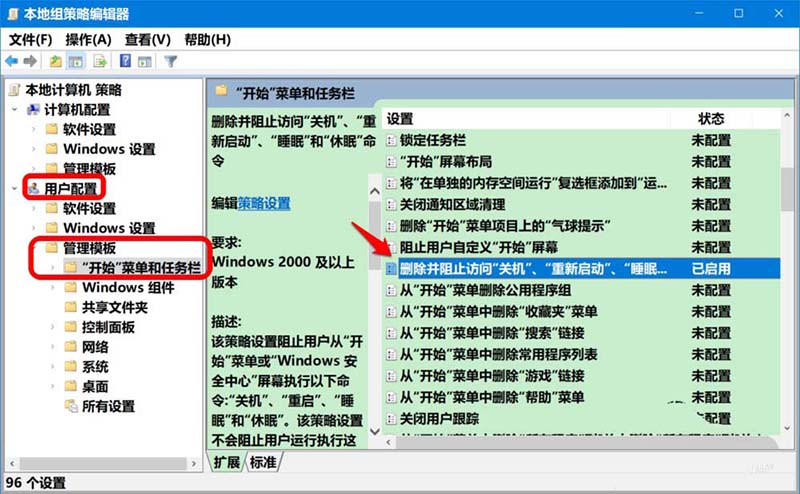 2、在本地組策略編輯器窗口中,展開【用戶配置】-【管理模板】-【開始菜單和任務欄】在對應的右側窗口中找到并左鍵雙擊:刪除并阻止訪問關機 ,重新啟動,睡眠... ;