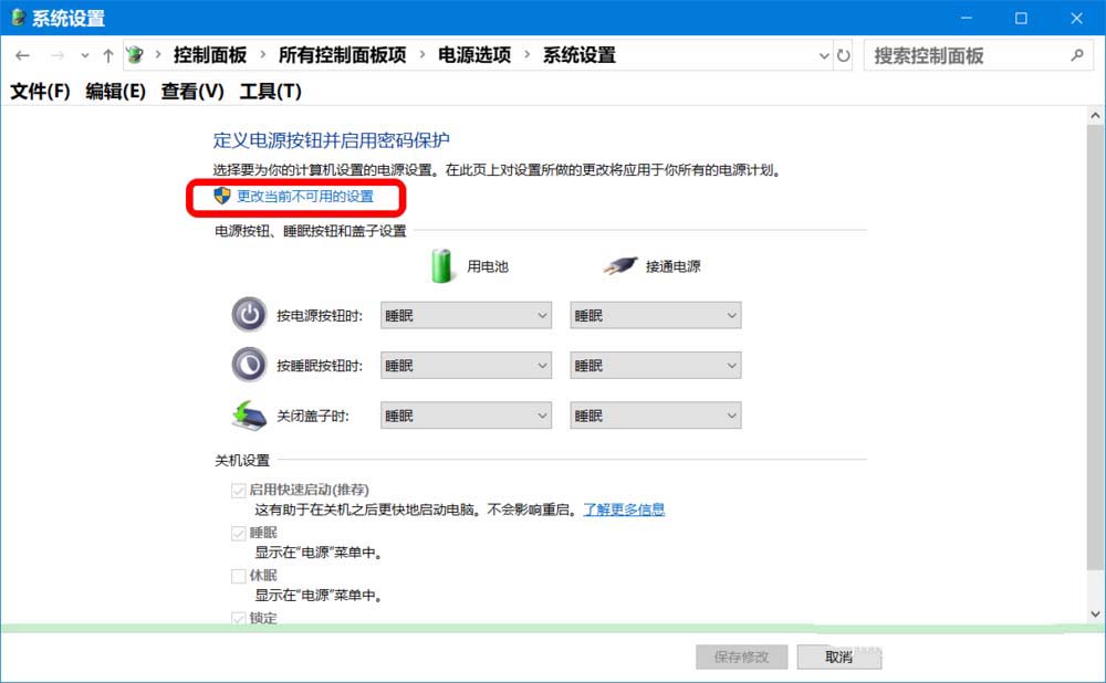 3、在打開的電源選項 -系統設置窗口中,點擊【更改當前不可用的設置】;