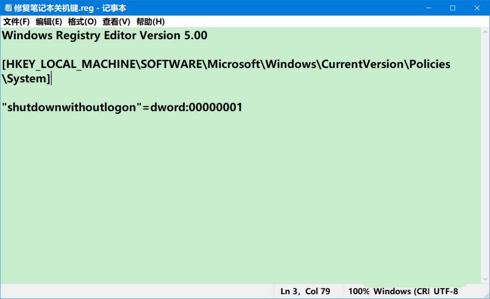 1、制作一個【修復筆記本關機鍵.reg】注冊表文件添加到注冊表中。