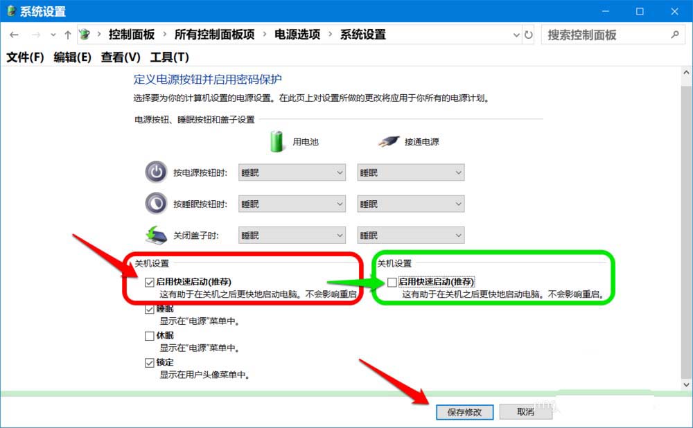 啟用快速啟動(推薦) 復選框中打了【 √】,點擊去【√】,再點擊:保存修改,退出。