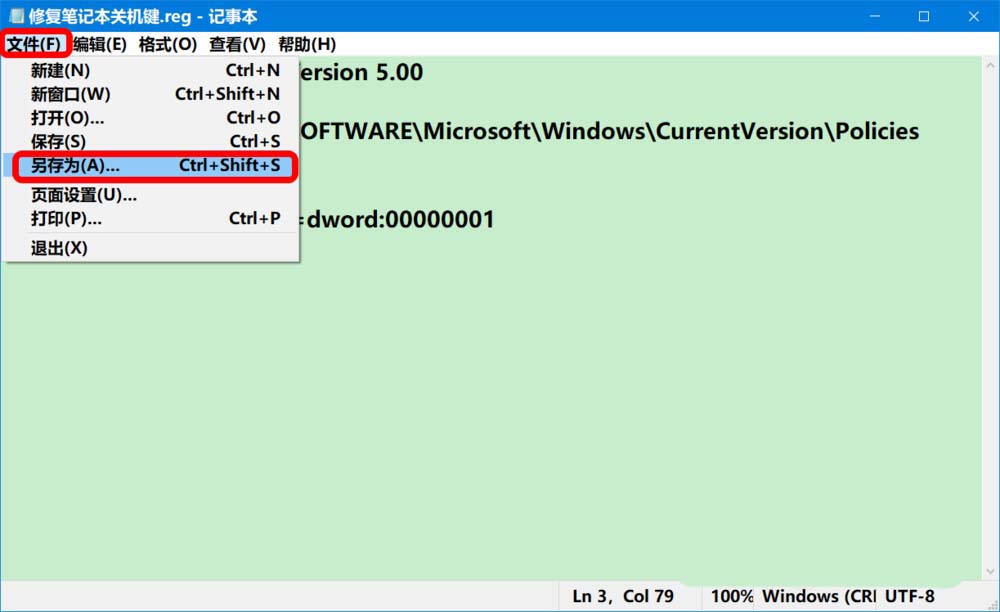 2、點擊記事本窗口左上角的【文件】,在下拉菜單中點擊【另存為】或按下鍵盤上的 Ctrl+Shifr+S組合鍵,打開【另存為】窗口;