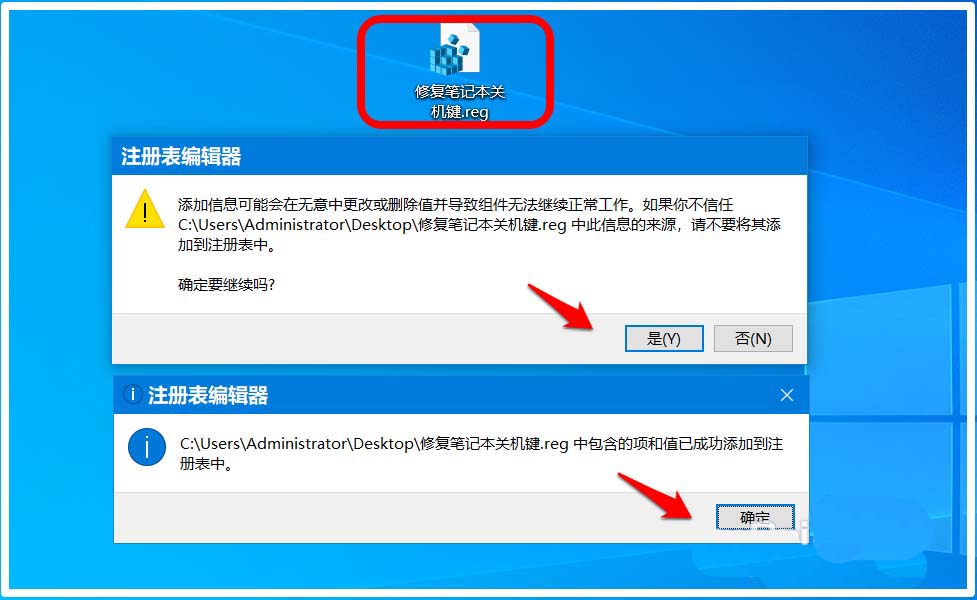 4、在系統桌面上找到并左鍵雙擊【修復筆記本關機鍵.reg】注冊表文件圖標,在先后彈出的注冊表編輯器對話框中點擊:是(Y)和確定。