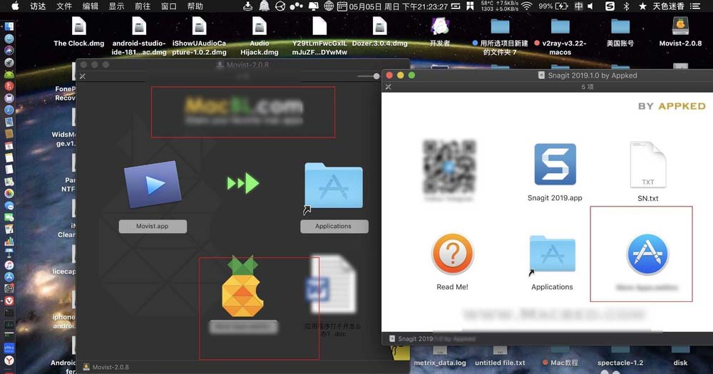 2、快捷鍵cmmand+delete刪除,那么就可以做下面的一個步驟了。圖二的左邊的應用是國內的應用,就是修改后的應用,右邊的原版的應用,未曾修改了 。這里你發現了什么,替換了,替換了很多文件。等于國內的站長把國外dmg搬過來,然后重新打包。所以很多經過國內打包的軟件,都是有問題的。缺斤少兩,解決的方法就是刪除了,重新下載。不信請測試。
