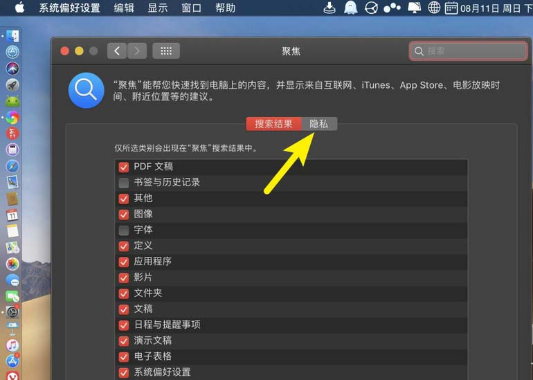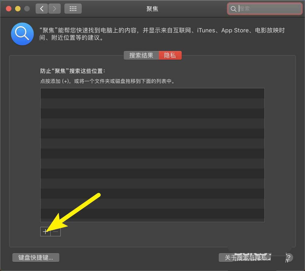 7、那么此時文件夾會出現(xiàn)在聚焦隱私上,那么使用聚焦搜索,就不會搜索到這個排除的文件夾。