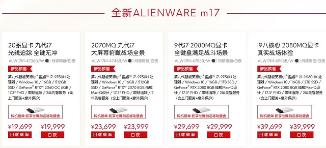 i7-9750H + RTX 2060 + 16GB + 512GB SSD:19699/19999 元(月球暗面/白夜)