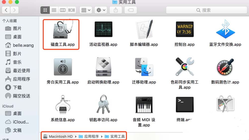 1、打開 訪達項目窗口里“應用程序”下的“實用工具”文件夾里面的“磁盤工具”。