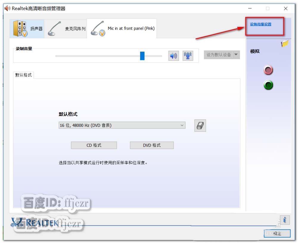 6、在Realtek高清晰音頻管理器中,點選右上角的設備高級設置