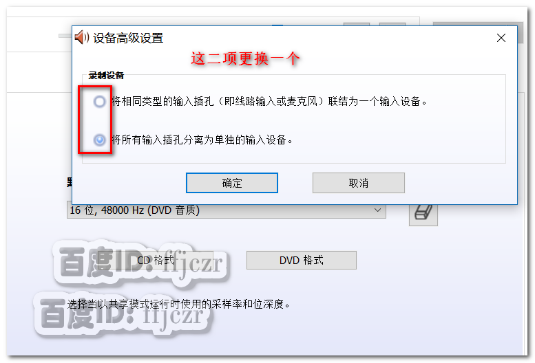 7、在彈出的設備高級設置選項中,會有二個選項;不管目前是點選了哪一個選項,只要更換另一個。然后拔掉耳機重插。即可。