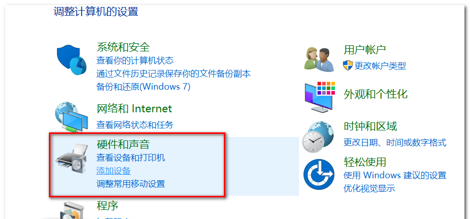 4、在控制面板中點選硬件和聲音。