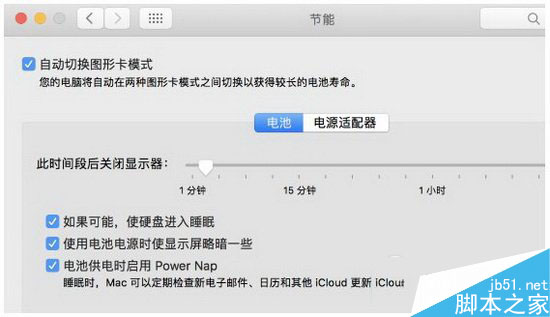 首先,我們需要進(jìn)入系統(tǒng)偏好設(shè)置 - 節(jié)能,然后勾選“自動切換圖形卡模式”,這項(xiàng)功能是默認(rèn)開啟的。