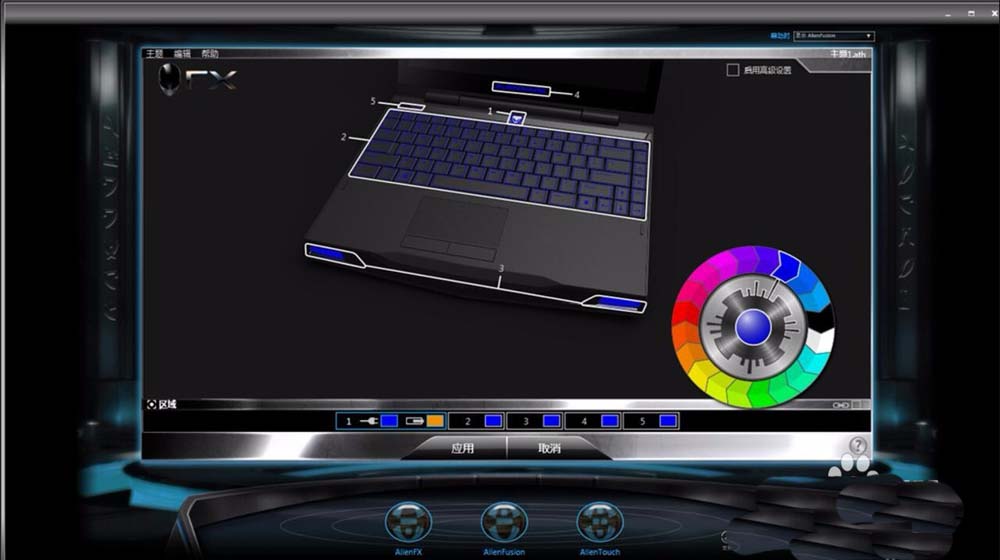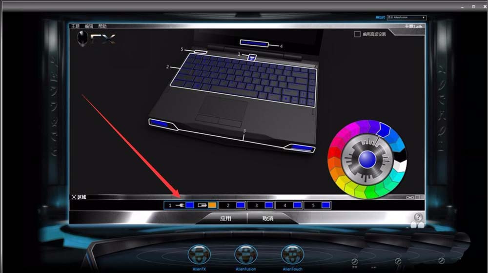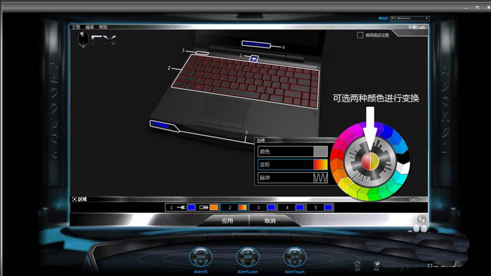 5、然后選擇2,就是鍵盤設置。選擇“變形”時,通過色輪中心左右兩個半球顏色的設定,鍵盤的燈光就會在這兩種燈光中變來變去。選擇“脈沖”時,鍵盤區域的燈光將以選定的顏色快速閃爍。