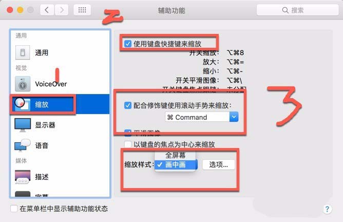 3、點擊左側面板的縮放選項,然后在右側面板有兩種方式放大或者縮小屏幕。第一種是快捷鍵的方式,第二種是快捷鍵加觸控板的方式。根據自己需要選擇。點擊縮放的樣式分為兩種畫中畫或者單純方法。畫中畫模式就是會在鼠標周圍出現一個放大鏡的方框,方框內的內容都將放大。單純模式則沒有。