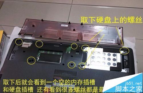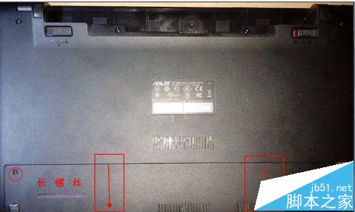 2、把硬盤長條蓋子拿下來 上面左右各一個螺絲卸掉放好位置別丟了,裝的時候記住在哪里,千萬別裝錯螺絲不然容易頂鼓包!蓋板螺絲擰下來以后把蓋板往下拉就下來了 箭頭標注的位置!