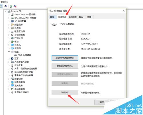 3、雙擊”PS/2標準鍵盤“,其他品牌的具體名稱可能不一樣,但是雙擊都可以;在屬性中先點擊上面一行的“驅動程序”,然后點擊“卸載”“確定”,出現 ”重啟計算機“提示的時候,選擇 不立即重啟。