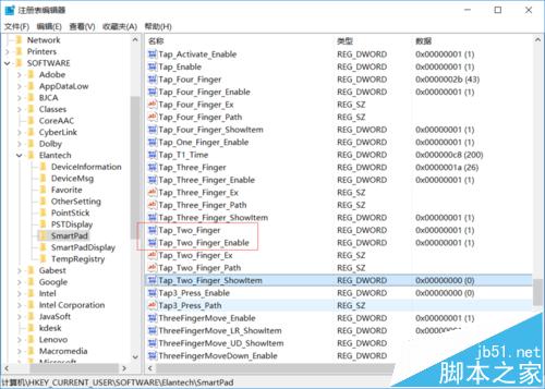 2、在HKEY_CURRENT_USER/SOFTWARE/Elantech/SmartPad注冊表目錄下找到Tab_Two_Finger與Tab_Two_Finger_Enable兩項,把其值都改成1。保存。