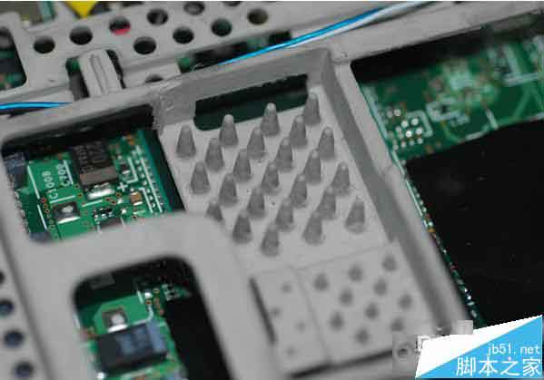 下面有硅膠涂抹的部分便是兩大核心硬件,顯卡與處理器,保護的很嚴實,上面還有黑色的塑料薄膜層,中間位打孔型,只為露出部分便于與散熱模塊直接接觸~!
