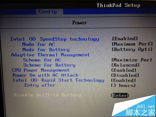 2、關機,拔掉t450的交流電源,用電池供電,重啟并按“F1”,進入bios,選擇“config”->“power”,再選擇“Disable Build-in Battery”,按下“回車”,選擇“Yes”,t450會立刻關機 。