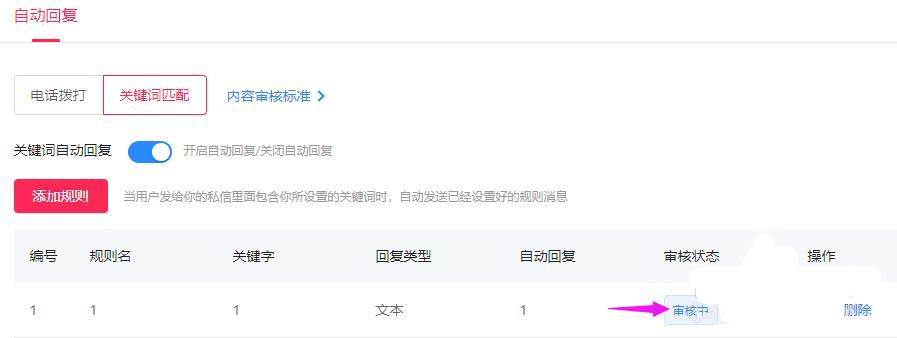 這個時候在審核狀態中,顯示“審核中”,審核成功即可有關鍵詞回復了