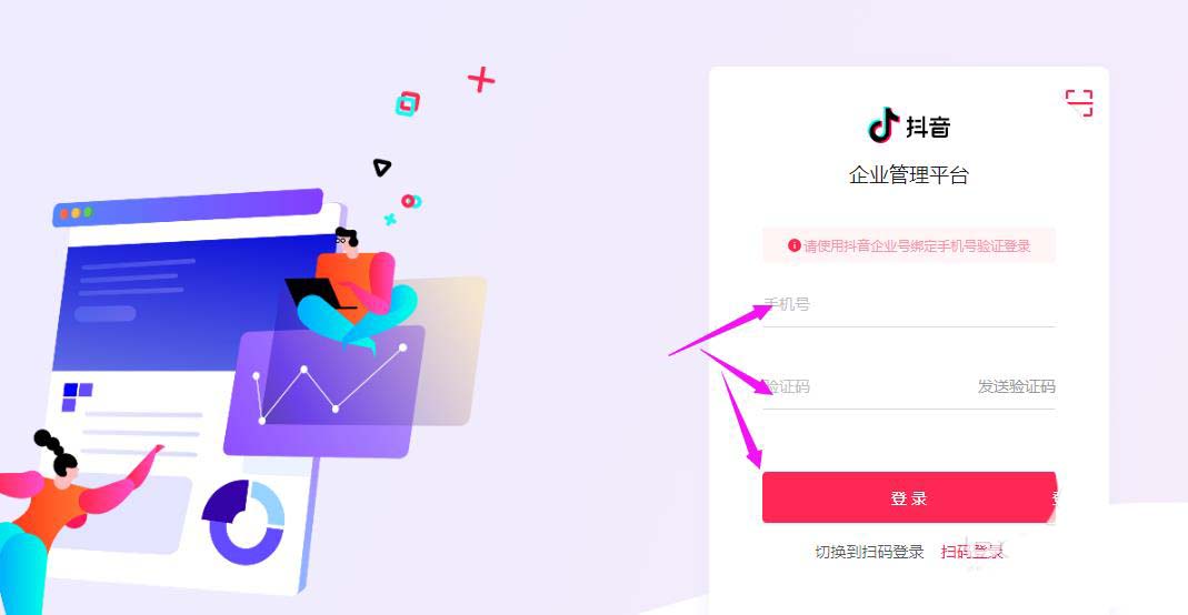 輸入抖音企業號的手機號、驗證碼,然后點擊“登錄”