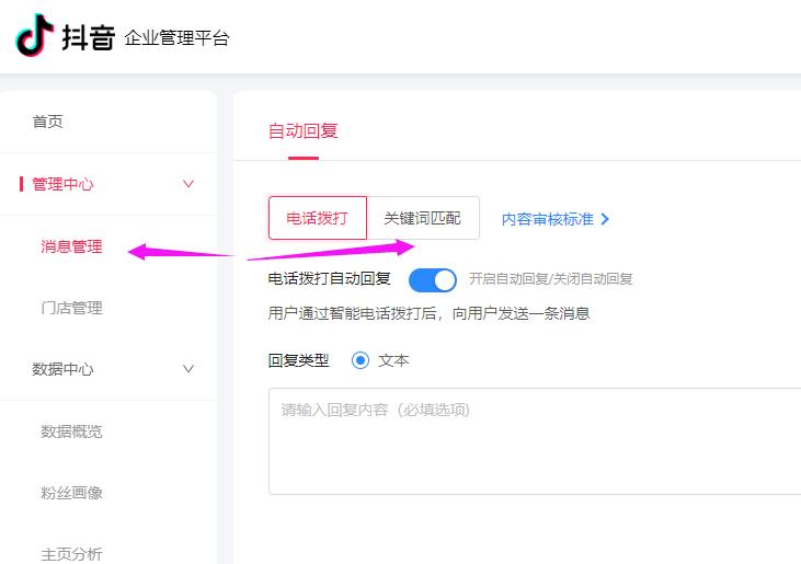 進入抖音企業號管理平臺之后進入管理中心→消息管理,就可以看到有個自動回復功能了!
