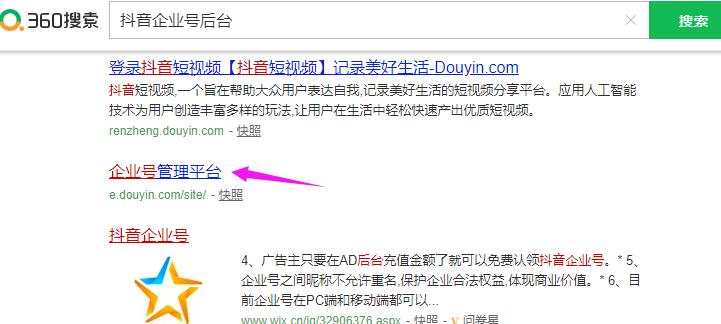 打開電腦瀏覽器,在搜索框輸入“抖音企業號后臺”,我們看到“企業號管理平臺”點擊進去