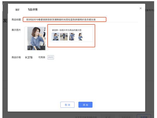 7、選擇商品后,展示商品信息預覽彈窗,支持標題修改、圖片選擇,最終點擊頁面下方“添加”按鈕即可將商品插入視頻。