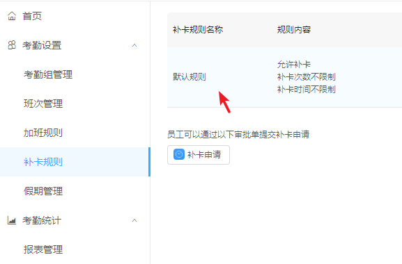 3、補卡規則只有一個,無法使用新建等功能,只可以對默認的規則進行編輯。