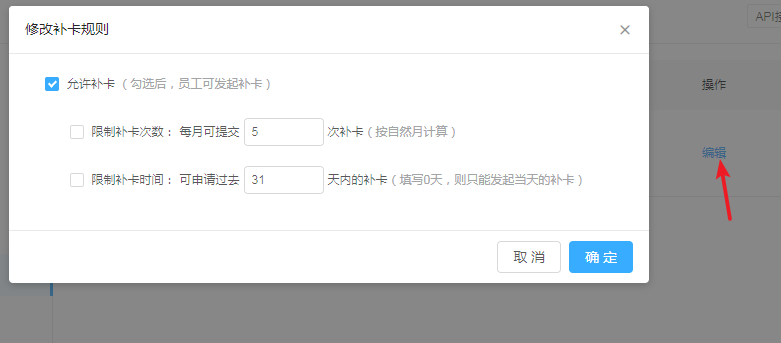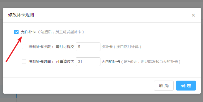 5、勾選上“允許補卡”,開通補卡功能,不然就無法補卡。