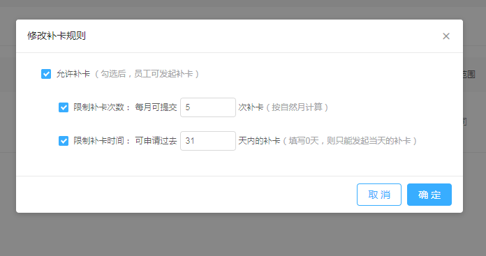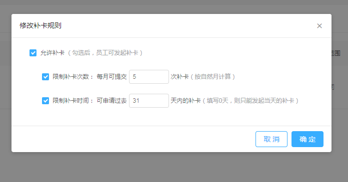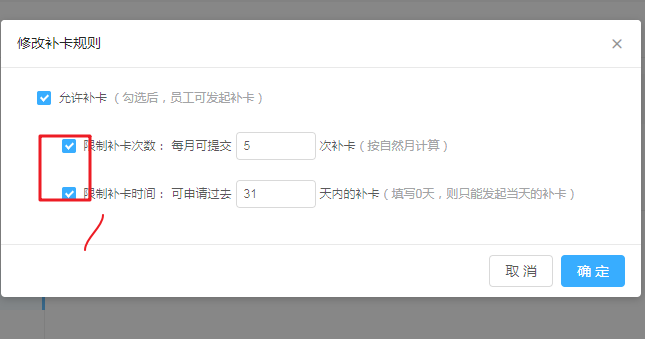 6、分別勾選上限制補卡次數、限制補卡時間,可以設置允許在多少天內發起發補卡,并且只能補卡多少次,否則將無限制。具體可以根據公司的規章制度來設置。