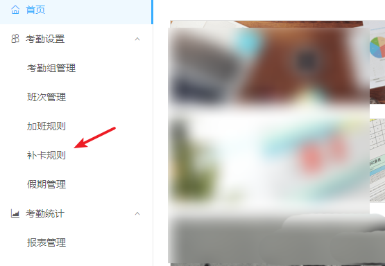 2、進入考勤打卡管理界面,在左側的菜單中點擊【補卡規則】