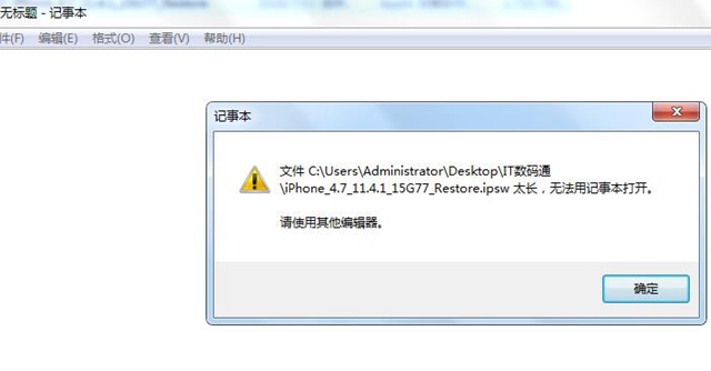 ipsw文件并不是普通的文本文件,因此無(wú)法通過(guò)記事本等工具打開,使用記事本等文本工具打開直接報(bào)錯(cuò),顯示無(wú)法使用記事本打開,如下圖所示。ipsw文件一般需要借助iTunes工具來(lái)打開,這個(gè)是蘋果官方出品的刷機(jī)工具。