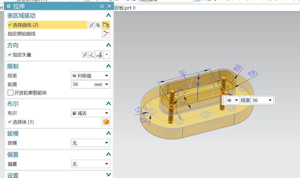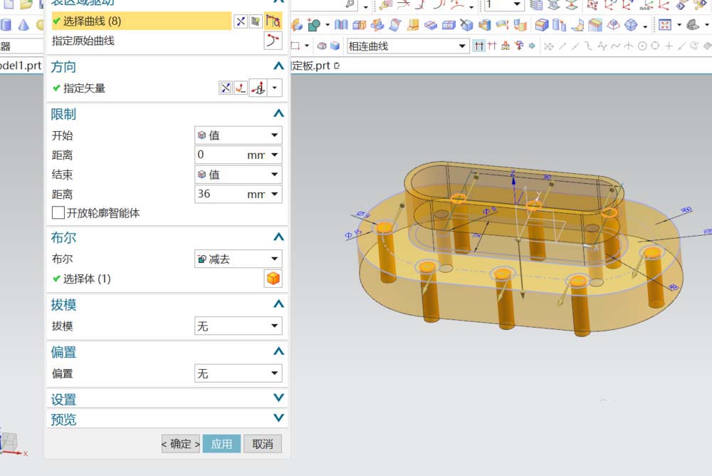 7、選用拉伸命令,對繪好的孔線進行拉伸,選用布爾求差;得到孔的造型,如圖所示。最后對利邊進行倒1的斜角,完成模型。