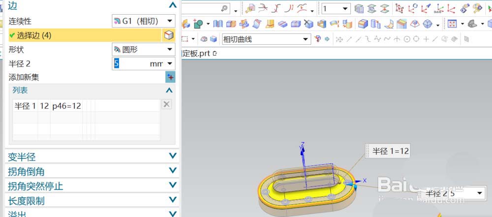 6、在進行開孔前,先將實體凸起處進行倒圓角,因為其圓角過大,如果沒倒圓角就開孔,最后再倒圓角,得到的模型不是理想的。此時可以連同其它要倒圓角的地方一起完成。