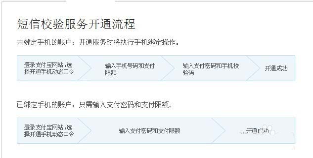 4、短信校驗(yàn)服務(wù)開(kāi)通流程詳解,未綁定手機(jī)的賬戶(hù),開(kāi)通服務(wù)時(shí)將執(zhí)行手機(jī)綁定,已經(jīng)綁定手機(jī)的賬戶(hù),只需輸入支付密碼和支付限額即可。