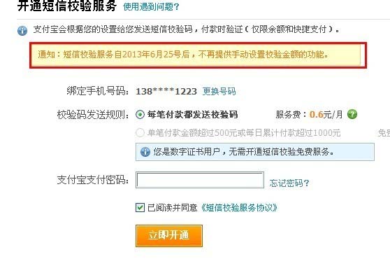 3、點(diǎn)擊輸入支付寶支付密碼,立即開(kāi)通,短信校驗(yàn)服務(wù)自2013年6月25號(hào)后,不再提供手動(dòng)設(shè)置校驗(yàn)金額的功能。