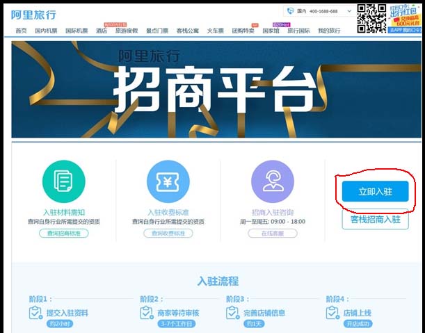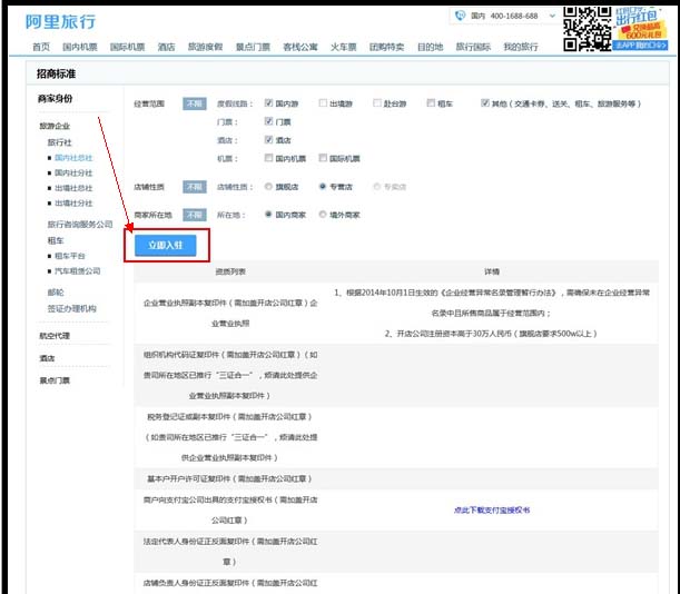 1、進(jìn)入飛豬招商頁(yè)面,點(diǎn)擊“立即入駐”開(kāi)始報(bào)名。通過(guò)首頁(yè)的入駐類型可查看資質(zhì)清單和收費(fèi)標(biāo)準(zhǔn)