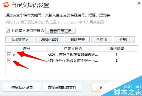 第五步:可以看到剛剛設(shè)置的2個(gè)快捷短語,需要先【確定】保存記錄,在來試下z和zz吧!如下圖所示: